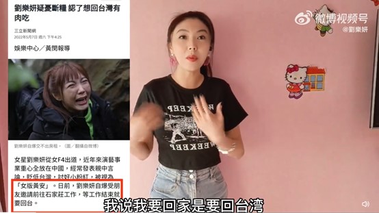 劉樂妍10日發布影片並表示,6月份在石家莊接了一場商演,表演結束後「要拼一台順風車回家」,而這裡的家指的不是台灣,而是回到位在燕郊的住處,她還激動怒嗆,「誰回台灣啊!真是臭美,現在回台灣我是得多想不開啊?回去送死嗎?」不僅如此,她還表示自己怕熱,「停電我可受不了,沒水洗澡我可會發瘋的」,一字一句都相當具有攻擊性。