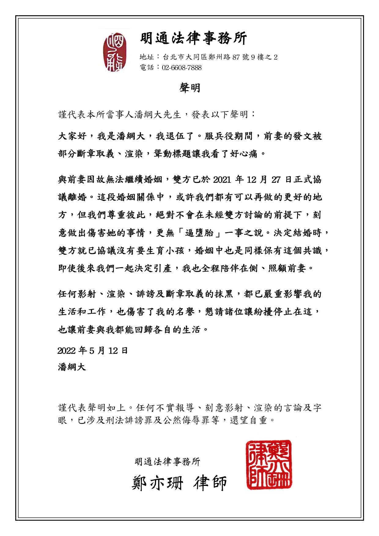 潘綱大在今年年初遭前妻指控「無套逼妻墮胎」,由於當時正在當兵,所以他都沒有多做回應,如今他終於正式退伍,便在13日透過臉書發聲明表示,「與前妻因故無法繼續婚姻,雙方已於2021年12月27 日正式協議離婚」。他也透露,在婚姻中一定有可以做得更好的部分,「但我們尊重彼此,絕對不會在未經雙方討論的前提下,刻意做出傷害她的事情」,並強調「更無『逼墮胎』一事之說」。