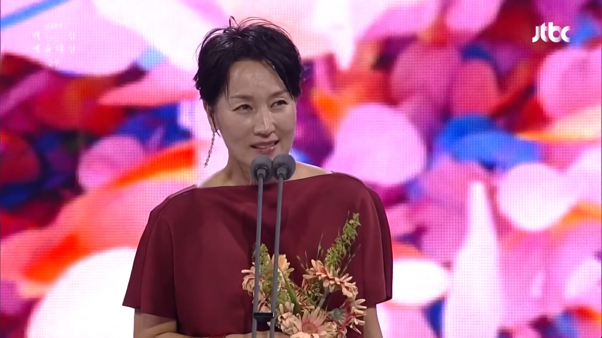 另外,59歲女星李慧英在典禮中以《在你面前》的「尚玉」一角風光摘下影后寶座,睽違33年再獲此殊榮,讓她感到相當開心,不過她的穿著卻遭到《YTN》無情的批評,被認為是本屆最差造型!記者看了直呼,她的選色不正確,「避免穿紅色禮服走在紅毯上是有原因的,背板、地毯都是紅色,完全就被隱沒了,完全隱藏身體線條的剪裁,也令人難理解」。