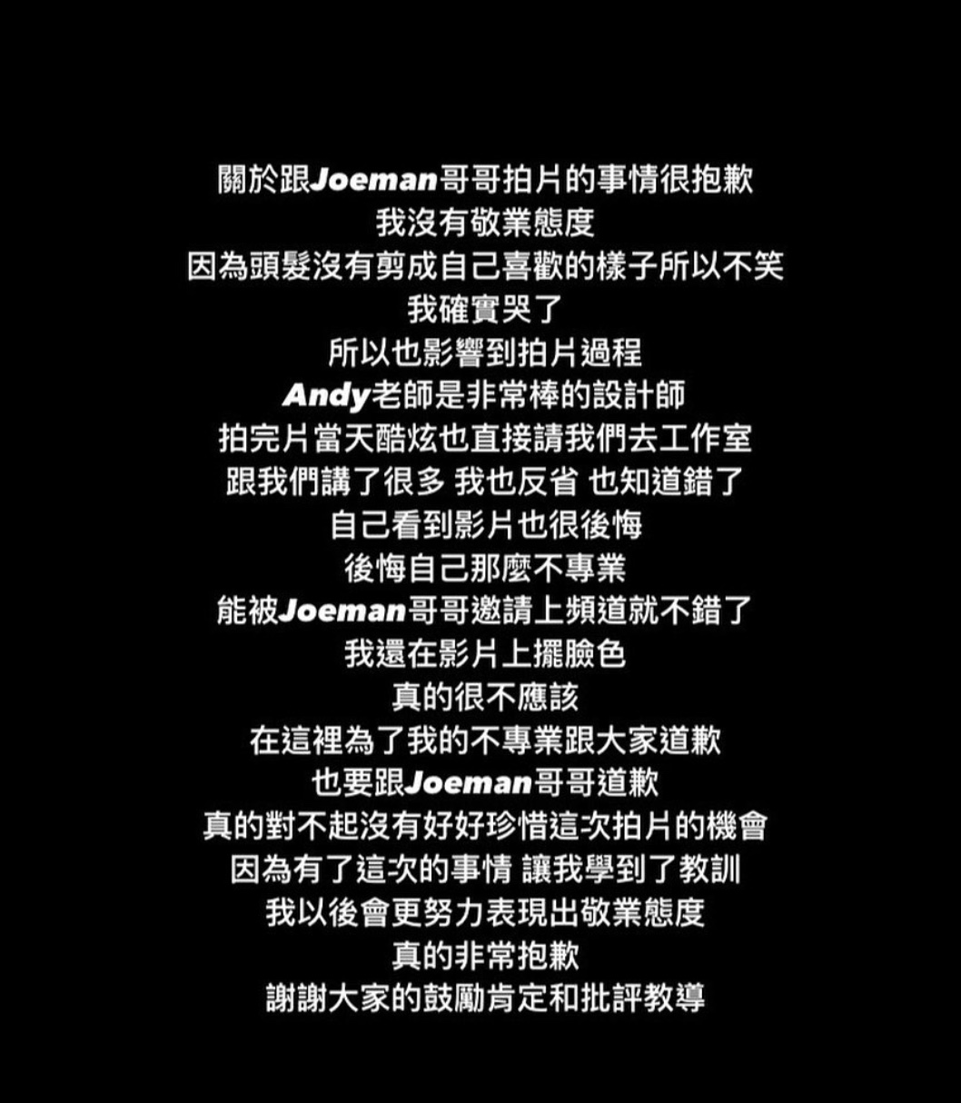 宸妹也表示,Andy老師花那麼多時間幫我剪,真的很抱歉!Andy老師人很好,也沒有責怪我,但也因為這件事讓我更懂做人的道理,以後會更努力表現出敬業態度的!也會有感恩的心,大家對不起,也造成Andy老師的麻煩了, 真的很抱歉。」最後宸妹也謝謝大家給予鼓勵肯定和批評指導!