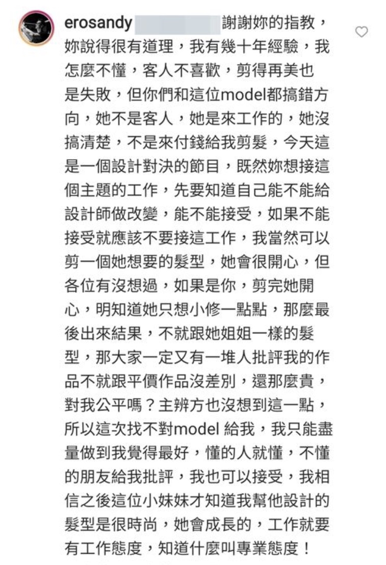 而設計師Andy也在IG發文表示,部分網友跟宸妹一樣搞錯了方向,認真的向大家說明,「她不是客人,她是來工作的,她沒搞清楚,不是來付錢給我剪髮,今天是一個設計對決的節目,既然你想接這個主題的工作,要先知道自己能不能給設計師作改變」。設計師接著說,「若是配合宸妹的喜好,真的就只修那一點點,大家又會覺得他的作品跟100元剪髮差不多」,認為這樣對他來說是不公平的。