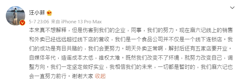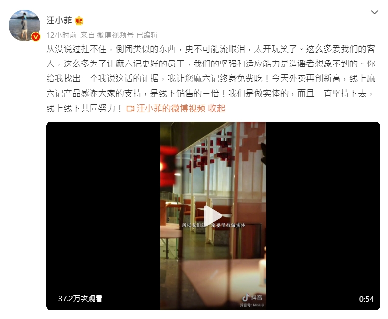 針對連日以來的謠言,汪小菲16日在微博上嚴正表態:「從沒說過扛不住,倒閉類似的東西,更不可能流眼淚,太開玩笑了。」並向酸民開炮,「你給我找出一個我說這話的證據,我讓您麻六記終身免費吃!」不僅如此,他還透露外送業績屢創新高,網路銷售的業績遠比實體店面高出三倍之多,並強調品牌是由實體店面起家,因此會繼續堅持下去,展現出十足的自信心。