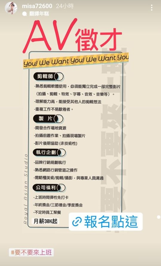 米砂14日在IG限時動態公開招募AV事業的新員工,並寫著斗大的「要不要來上班」,吸引了許多人的目光!這次徵才一共招募了剪輯師、製片及執行企劃,總共三個職缺,起薪皆為3萬整,除此之外,也詳細列出了各個職位需要具備的能力,也公開了公司福利,其中包含上班時間彈性免打卡、不定期員工聚餐,以及年終、三節、季度獎金,希望能夠吸引有志從事相關行業的人可以來投履歷。