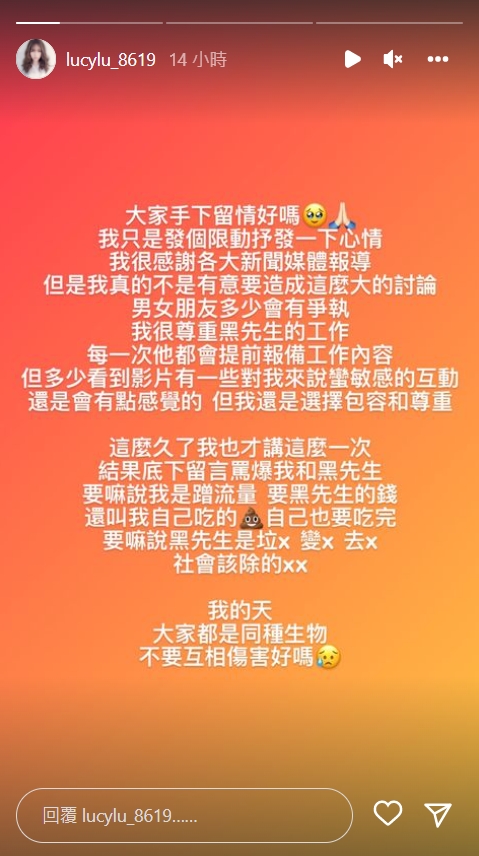 接著,Lucy無奈表示:「這麼久了,我也才講這麼一次,結果底下留言罵爆我和黑先生」,強調自己並非有意引起騷動,單純是想要抒發心情,也希望大家能夠手下留情,不要互相傷害,掀起熱議!