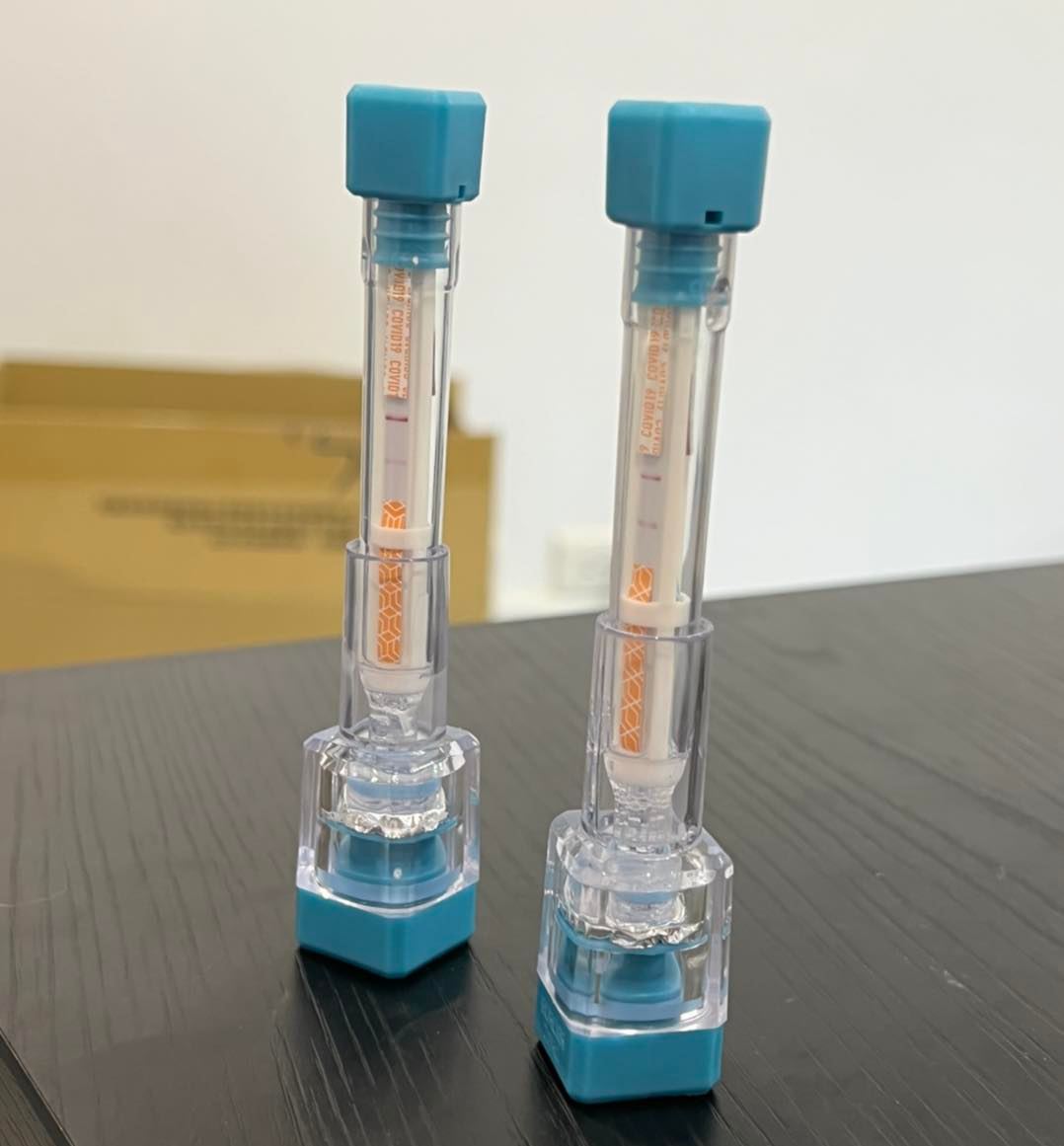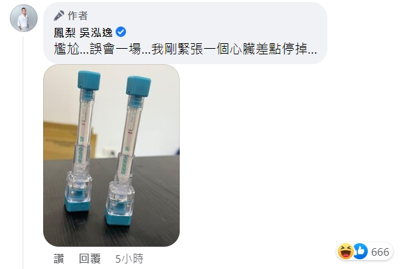 鳳梨16日在臉書曬出快篩結果的照片,只見圖中的試管顯示出淡淡的第二條線,沒想到前幾天才開玩笑說要「拚確診」,如今竟然一語成讖,雖然無奈但他仍不改往常的搞笑風格表示:「人森無常,大腸包小腸…」不過立刻就有眼尖的網友發現,鳳梨使用的是抗原、抗體合一的唾液快篩,橘色面會顯示有無抗體,藍色面才是真正顯示有無確診,但他卻將兩者搞混,鬧出烏龍。