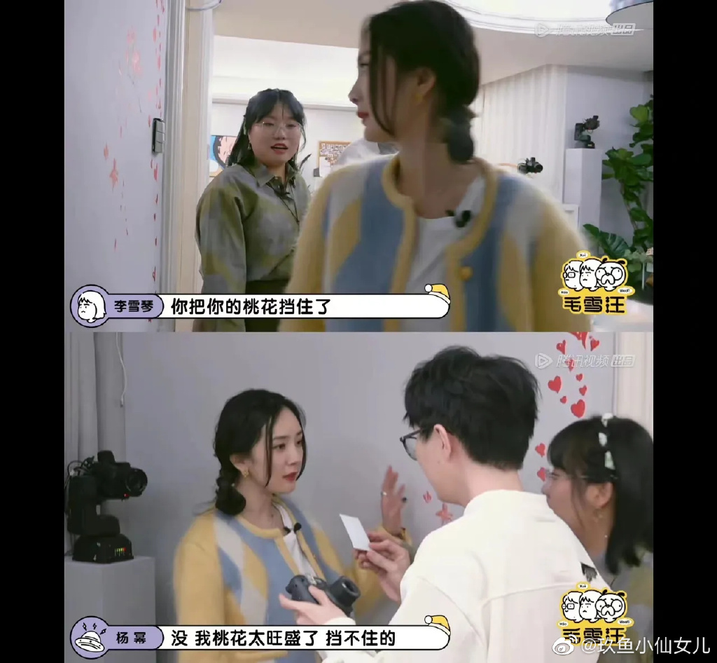 當時楊冪談到自己的感情觀,認為談戀愛不該太複雜,不用花時間去懷疑對方會不會嫌自己老,或是對方因為自己有錢才主動接近。最近又有節目片段流出,可以看到楊冪和一群人合照,被提醒她擋住背後的桃花壁畫,楊冪也淡定表示:「沒,我桃花太旺盛了,擋不住的。」