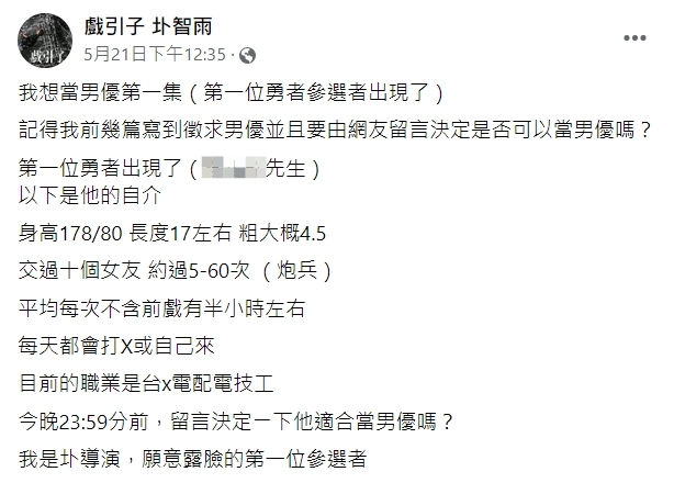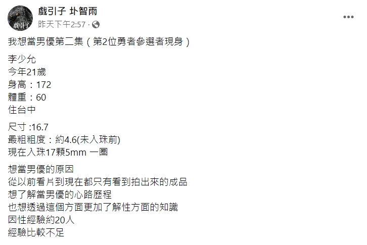 圤智雨22日在臉書公開第二位想當男優的候選人,該名小鮮肉年僅21歲,臉上還帶有些許稚嫩的氣息,在貼文中可以得知,他身高172公分、體重60公斤,看起來體態相當纖瘦,而他的下體長度16.7公分,粗度也有4.6公分,值得注意的是,他還透露「現在入珠17顆5mm的一圈」,可見當他「一柱擎天」的時候,無論視覺或觸覺都會相當驚人!