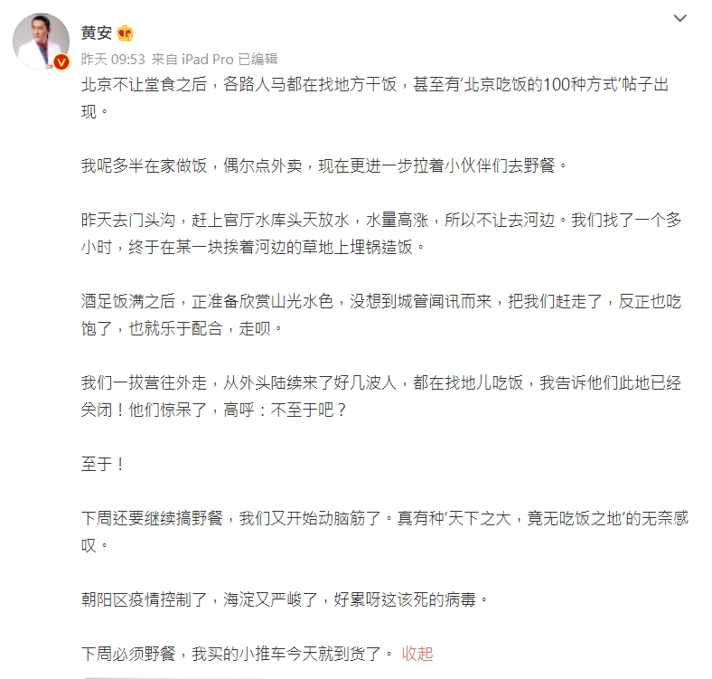 黃安24日在微博發文表示,自從北京禁止內用之後,許多人都在尋找吃飯的地方,在網路上還有人在討論「北京吃飯的100種方式」,而他自己則是選擇親手下廚,偶爾叫外送來吃,最近則是開始跟著三五好友一起去外面野餐!黃安也透露,有一次他與朋友一起到了河邊吃飯聊天,原本計畫在飽餐一頓之後要好好欣賞美景,沒想到卻遭到城管驅趕,雖然無奈,但本意就只是為了吃飯,所以就乖乖離開了。