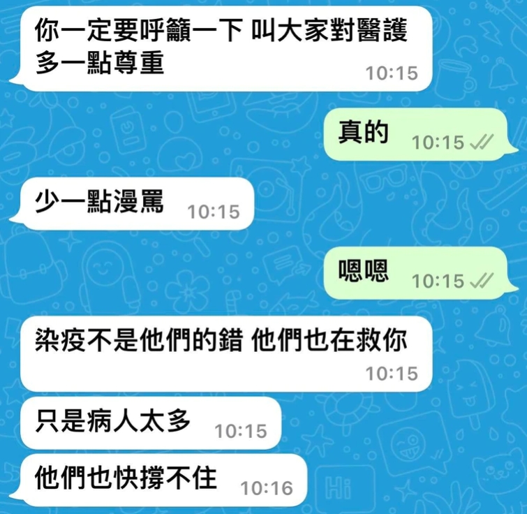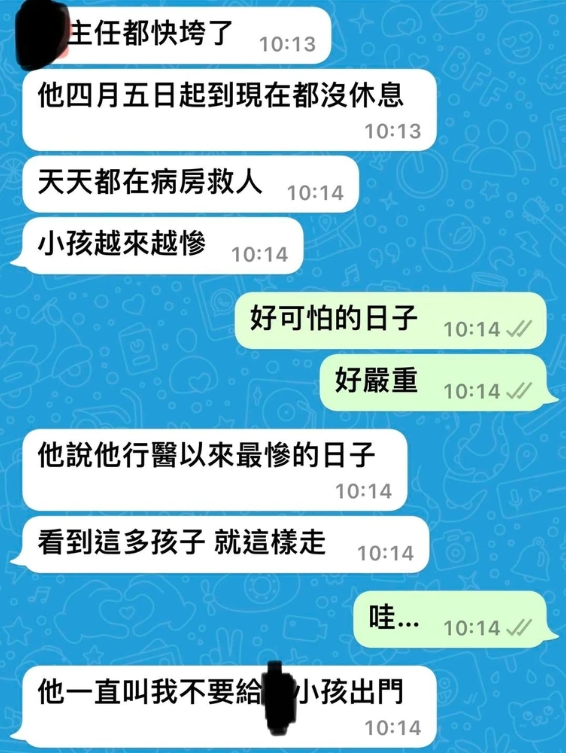 藝人郭彥均25日在臉書PO出自己與醫護朋友的對話截圖,對方表示因為疫情不斷升溫的關係,醫院同仁已經長達一個多月都沒有休息,努力加班只為了救更多的病人,更透露年紀小的病患情況越來越不好,還驚人表示,「看到這(麼)多孩子,就這樣走」,並希望郭彥均可以幫忙跟大眾呼籲,「多一點尊重,少一點謾罵!」,坦言染疫病人的數量已經超過醫護人員的負荷範圍,引發外界高度關注與討論。