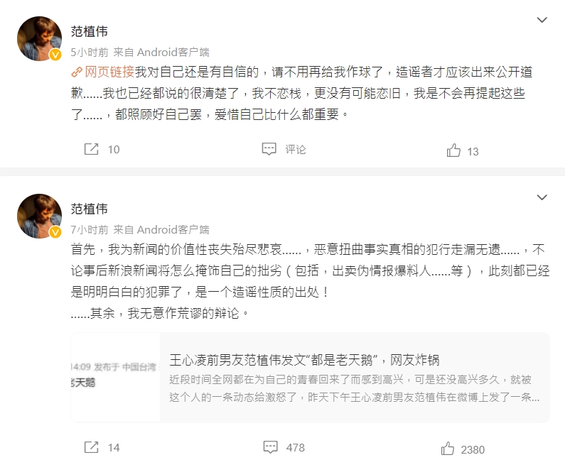 對此,范植偉27日直接轉發相關報導,火大批評該媒體是「惡意扭曲事實」,隨後又PO文要求造謠的人必須公開道歉,對於網友質疑他是否「還有感情」,他強調「沒有可能戀舊,我是不會再提起這些了!」,也間接否認蹭熱度一事。