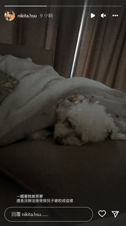 接著,舒子晨又PO出一張居特躺在沙發上休息的照片,看起來相當虛弱,而她的手也跟著入鏡,只見她的大拇指似乎保護愛犬的過程中也受了傷,她表示:「可憐兒子今天嚇壞了,你老母我陪你!被咬成這樣…我真的要哭死」,並坦言一睡著就一直做惡夢,對於居特被咬成這樣還是難以接受。