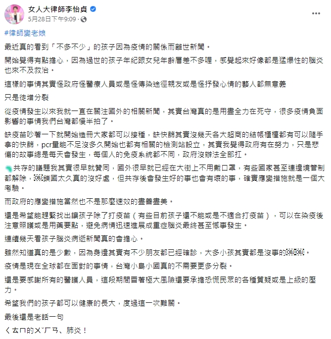 藝人郭彥均日前在臉書上發文表示,希望大家在疫情嚴峻時期,都能夠善待醫護人員,怎料文中的「看到這(麼)多孩子,就這樣走」竟意外引起關注,甚至連政府官員都揚言「要調查」,隨著事件越鬧越大,不少名人也出面發表個人觀點,其中律師李怡貞的貼文就被不少網友認為是在「幫政府說話」,她在29日再度發文澄清,立刻掀起網友的高度關注!