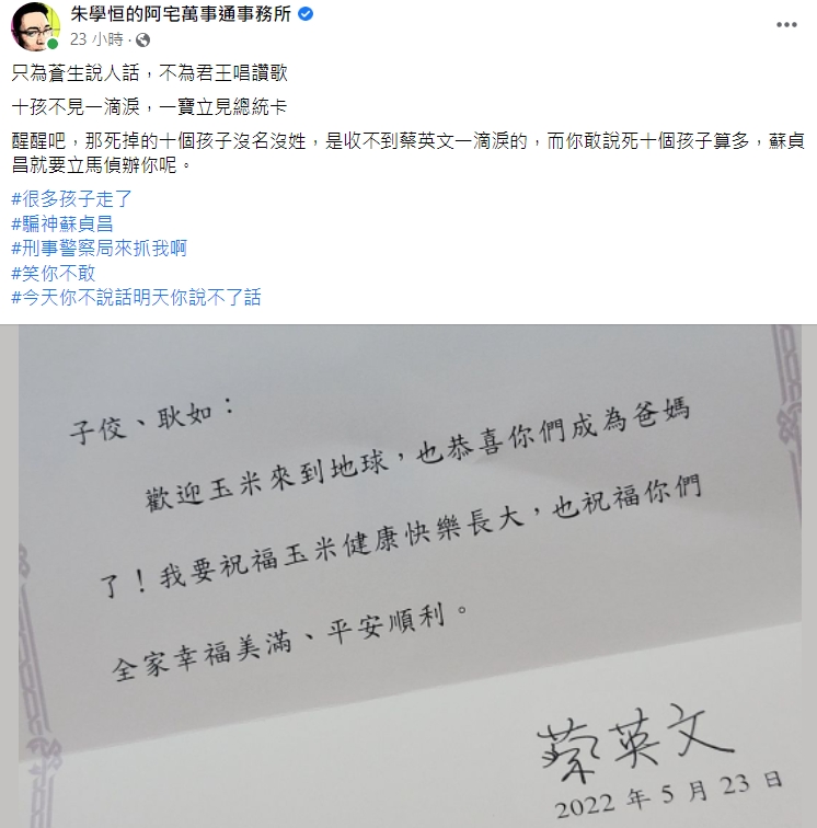 黃子佼生女收蔡英文賀卡!朱學恒酸「十孩不見一滴淚」 本尊親回掀關注