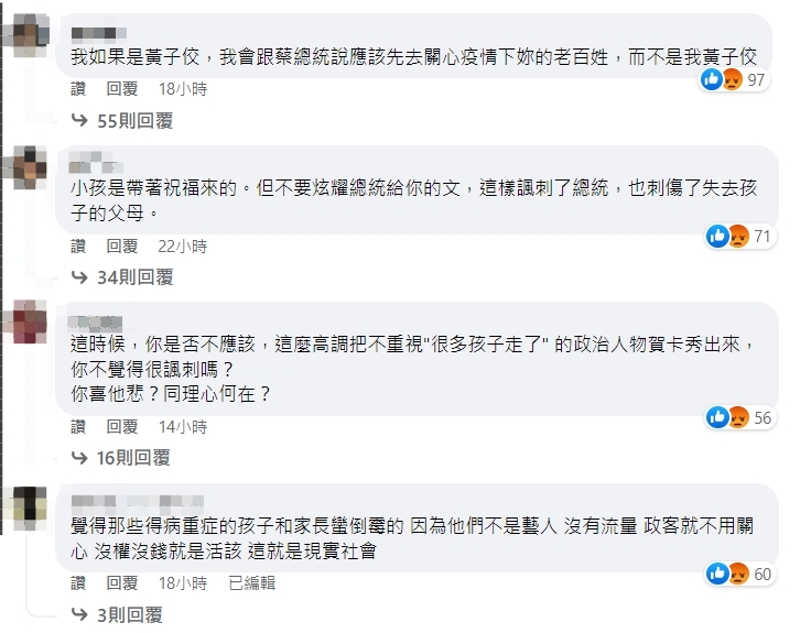 黃子佼26日在臉書上曬出眾多政治人物的祝福,其中包括台中市長盧秀燕送的花籃,還有新竹市市長林智堅、新北市市長侯友宜和屏東縣縣長潘孟安的祝福訊息,甚至連總統蔡英文都獻上賀卡,可見人緣相當好!然而原先的一番好意卻被牽扯上政治,像是朱學恒就轉發該貼文表示:「只為蒼生說人話,不為君王唱讚歌;十孩不見一滴淚,一寶立見總統卡。」並直指「那死掉的十個孩子沒名沒姓,是收不到蔡英文一滴淚的」,砲火十分猛烈。