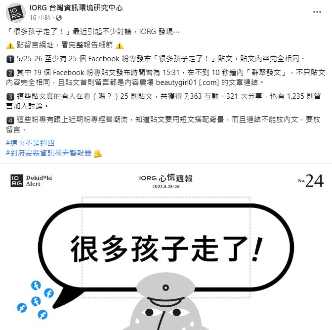 隨著郭彥均事件逐漸延燒,蘇貞昌28日受訪時也回應事件有明顯的操作痕跡,台灣資訊環境研究中心也公布25到26日有多達25個粉絲專頁發布「很多孩子走了!」的貼文,內容也幾乎一模一樣,希望國人不要誤信假消息,也將針對假消息來源以及散布謠言的內容農場究責查辦。