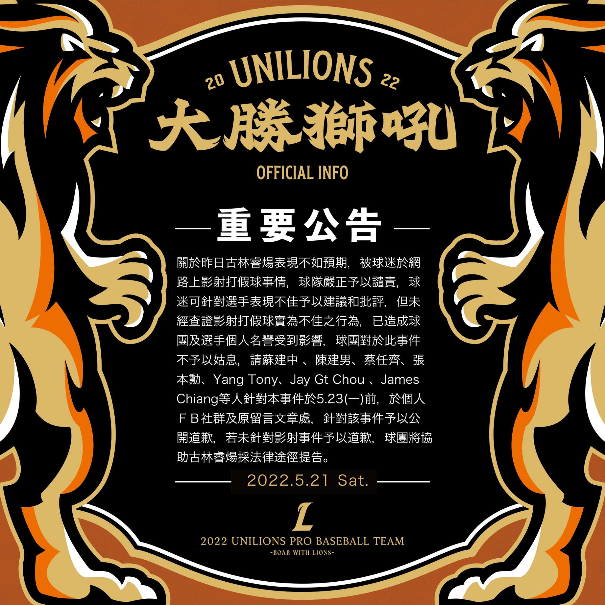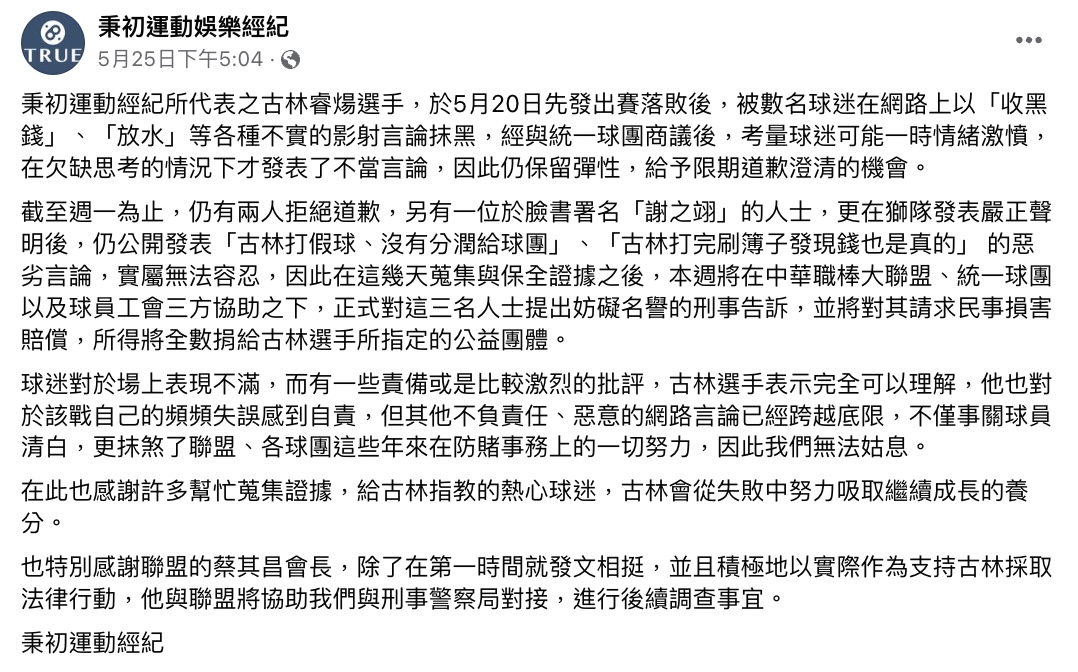 但截至本周一為止,仍有兩人拒絕道歉,另有一位於臉書署名「謝之翊」的人士,更在獅隊發表嚴正聲明後,仍公開發表「古林打假球、沒有分潤給球團」、「古林打完刷簿子發現錢也是真的」 的惡劣言論,實屬無法容忍。