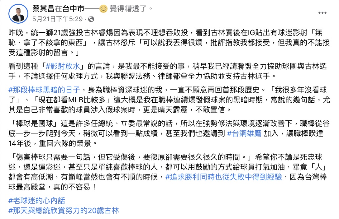 遭影射放水打假球!統一獅古林睿煬硬起來對三球迷提告