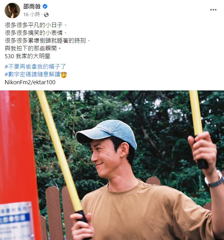 邵雨薇30日在臉書貼出吳慷仁的照片並表示:「很多很多平凡的小日子、很多很多搞笑的小表情、很多很多累壞倒頭就睡著的時刻、與我拍下的那些瞬間。」透露平時就有透過攝影紀錄生活的習慣,其中也有許多男友的照片。只見照片中,吳慷仁似乎是在公園玩運動設施,臉上還掛著得意的神情,感覺得出來心情非常好!