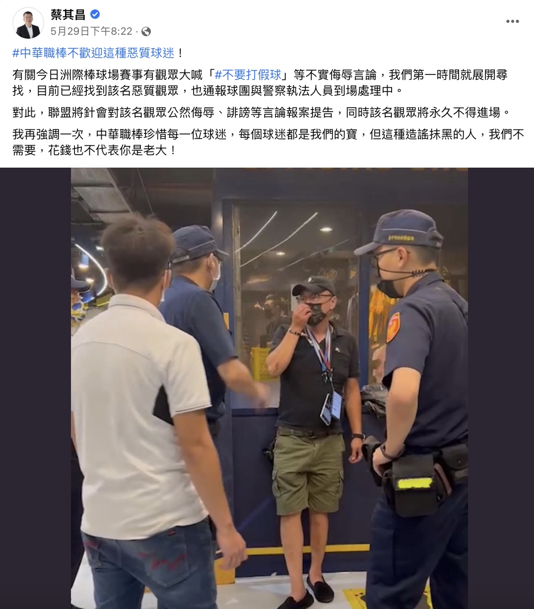 最近中華職棒的關鍵詞突然變成了假球,繼上週統一獅隊投手古林睿煬在網路上被影射打假球提告後,29日中信兄弟對戰味全龍的例行賽,竟然有球迷在洲際球場大鬧,甚至大喊「打假球」,結果馬上被工作人員和員警請出球場,中職也也火速宣布,將該位球迷列為黑名單禁止再入場,同時將提告。