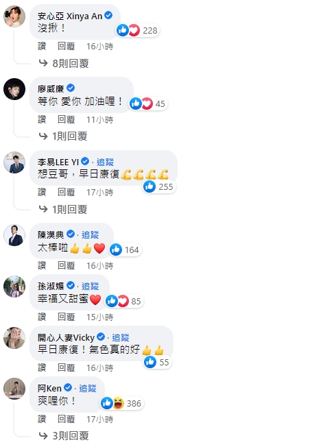 照片曝光後,留言區瞬間湧入一排「藍勾勾」關心他,像是跟他一起主持《同學來了》的安心亞、阿Ken就說道,「沒揪!」、「爽喔你!」其他人也紛紛留言表示,「女友依依真的很棒,把你照顧的真好!」、「看到你平安真的很替你開心~」、「要注意飲食,滿桌的甜點飲料,不可多吃少少的品嚐就好」。