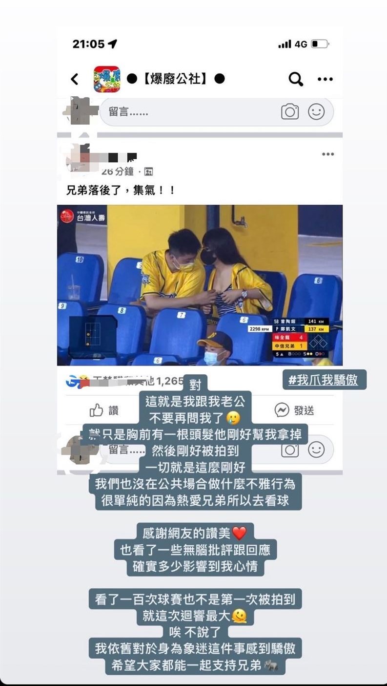 對此,該名正妹當事人也在個人IG做出回覆,她表示照片中的人就是自己跟老公,並解釋「就只是胸前有一根頭髮,他剛好幫我拿掉,然後剛好被拍到,一切就是這麼剛好!」並強調,「我們沒在公共場合做什麼不雅行為!」,只是熱愛中信兄弟而去看棒球而已,沒想到會造成這麼大的迴響,也希望大家可以一起支持中信兄弟。