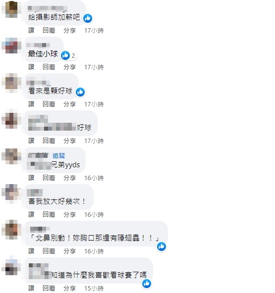 照片曝光後,網友紛紛表示,「兩好球了!」、「幫我看看好球帶在哪」、「知道為什麼我喜歡看球賽了嗎?」、「攝影大師該加薪了」、「影片是貼心的男生幫女生把胸口的毛髮去除,定格照片後怎麼好像色色的…」。