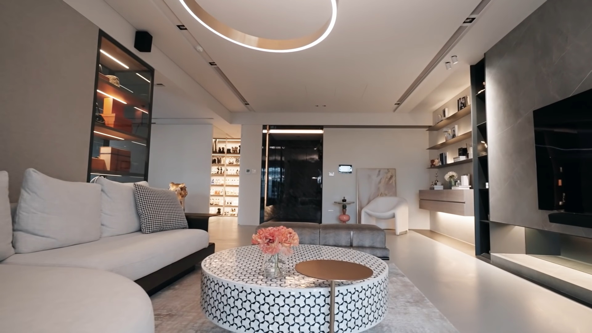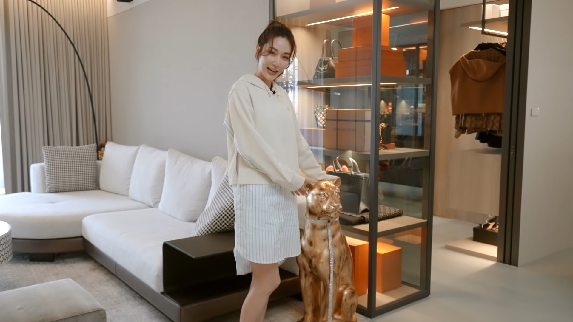 此外,曾莞婷在沙發旁還放了一隻幾乎是1比1大的金色豹雕像,脖子上還掛著閃閃發亮的牽繩,她笑說這隻豹現在是打卡景點,因為牠的名字叫「賺豹(爆)」,所以大家都會想討個吉利!另外,由於她很在意環境的溼度,因此還裝有全戶式除濕機,就連廚房都是量身打造,每一個角落都相當精緻漂亮!