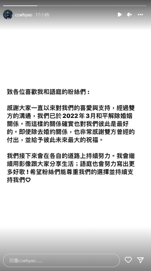 西西歪與施語庭9日在各自的IG上發出聲明表示,「經過雙方的溝通,我們已經於2022年3月和平解除婚姻關係。而這樣的關係確實也對我們彼此是最好的」。雖然兩人已經不再是戀人關係,但依然感謝對方在這段時間的付出,也會給予最大的祝福,「我們接下來會在各自的道路上持續努力」,並希望粉絲都能夠尊重他們的選擇,並繼續支持兩人。
