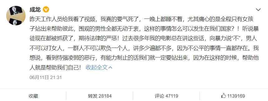 不僅如此,成龍看到影片後也氣到無法入睡,「尤其痛心的是全程只有女孩子站出來幫助彼此,圍觀的男性全都無動於衷。」成龍無奈表示:「這樣的事情怎麼可以發生在我們國家?」更呼籲外界:「有能力制止的話我們就一定要站出來,因為在這樣的時候,幫助他人就是幫助我們自己!」另外,張天愛、刑菲、馬天宇、孫怡、周翊然、楊迪、韓紅、夏之光、周雨彤等藝人也紛紛發聲。