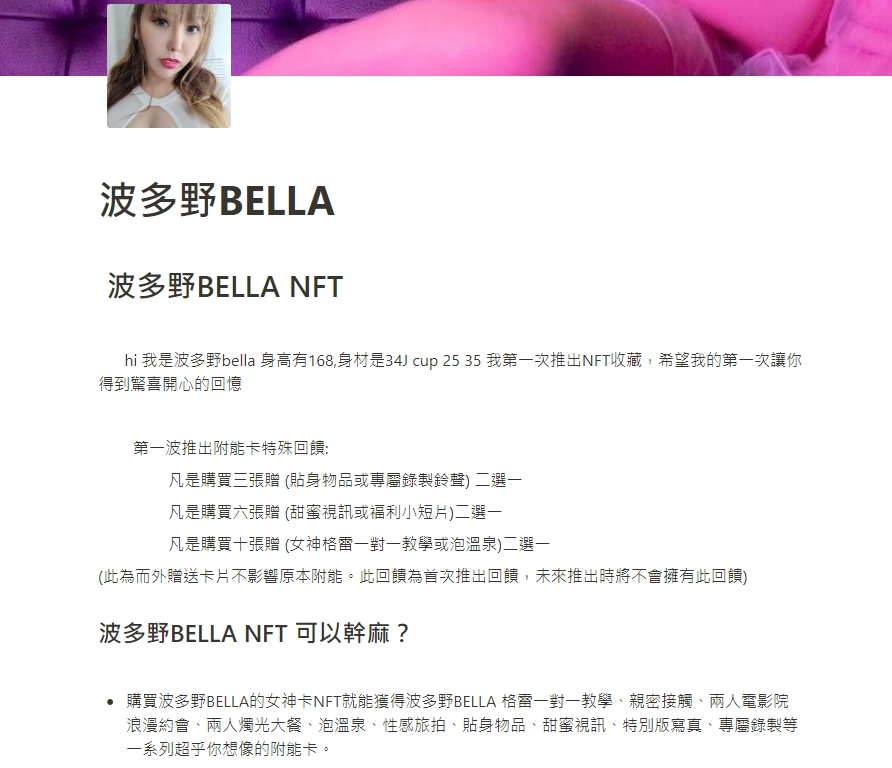 根據《鏡週刊》報導,Bella今年初推出個人「賦能NFT」,只要購買就有機會能和她約會、吃飯、泡溫泉或是視訊,因此吸引不少粉絲的關注!有網友購買之後與Bella面交現金8千元,事後詢問後續狀況時,對方卻給不出合理的交代,反而又向對方提議可以花3到10萬買「互動」,還推薦到可以到旅館休息,甚至在對話紀錄中露骨表示,「如果大浴缸還是去薇閣吧!不然兩人塞不進去」,言語相當有調情的意味!