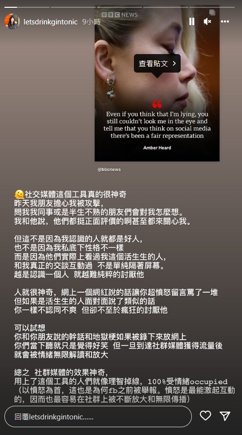 她也針對此事在13日透過IG限時動態無奈表示,身邊有不少朋友都來關心她的狀況,也給了正面的評價,但她認為並不是因為身邊的人都是好人,又或是自己私底下性格不一樣,而是這些人都「和我真正交談互動過,不是單純隔著螢幕」,認為只要認識了一個人,就很難「單純」的討厭對方,多少還是會顧及情分。