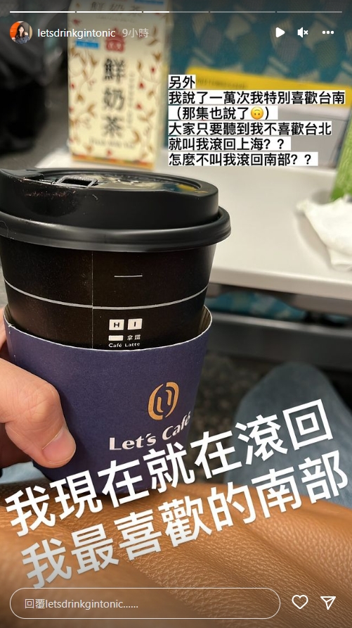 不僅如此,金湯力隨即PO出在高鐵上的照片並表示,「我說了一萬次我特別喜歡台南,大家只要聽到我不喜歡台北,就要我滾回上海?怎麼不叫我滾回南部?」並透露自己正在前往南部的路上,好心情似乎未受影響。