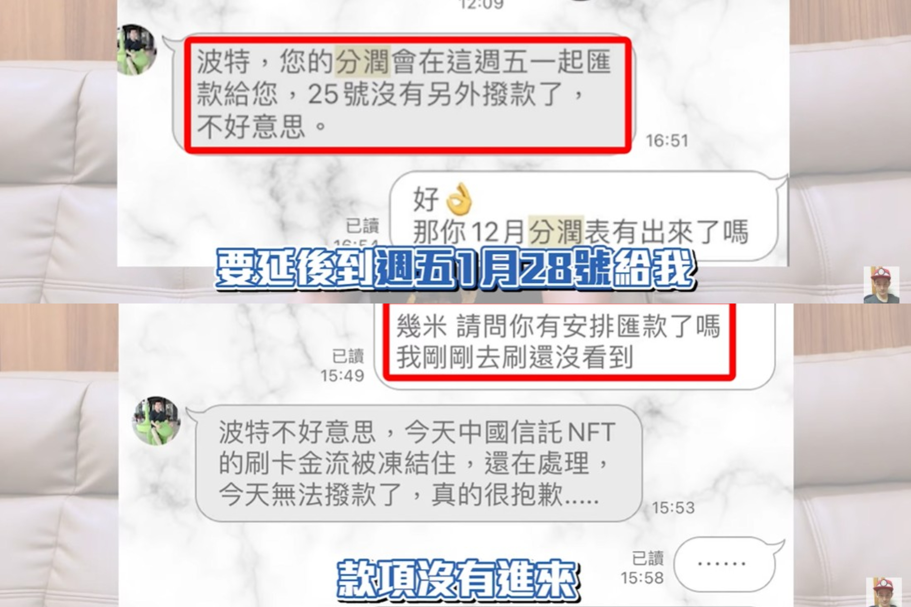 Mars先前在直播中澄清欠款都已經還清,合作的這段期間最多只有欠款4次,但波特王15日在影片中再度提出證據打臉對方的說詞,他表示前公司仍有業配款項未付清,也曬出與會計的對話紀錄截圖,從照片中可以發現公司撥款的進度一拖再拖,更表示合作6年期間,積欠次數早已超過10次,實屬違約在先!