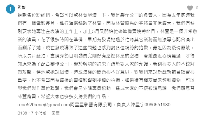 此外,跟林萱有合作關係的製作公司負責人也在Dcard留言區幫忙說情,負責人表示,林萱原先的業務量就非常大,去年底又成功通過了電影角色的海選,所以有特別要求她專注在表演工作上,再加上今年五月又開始準備另一個實境節目,所以花了很多時間在準備,一開始有發現她因為其他業務疏忽了演出而訓斥過她,結果導致現在發生這些問題,為此感到很抱歉,也承諾如果還有網友沒有領到禮物,可以請製作單位協助處理,並留下了相關資訊,並再度致歉。