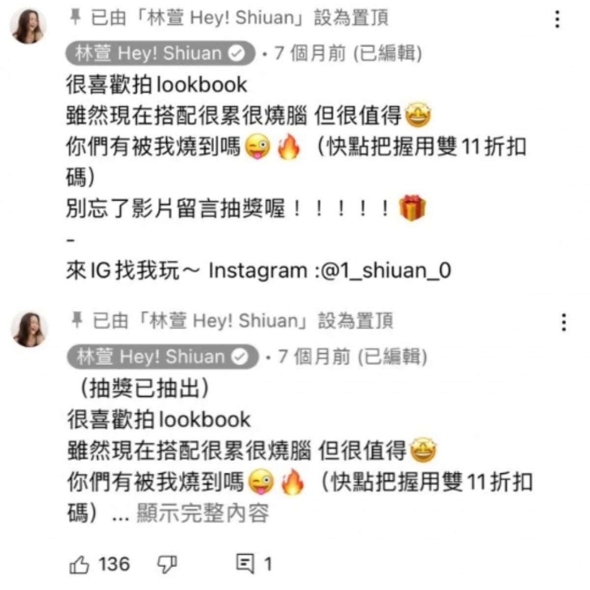 事情延燒三日後,林萱16日透過IG回覆網友,「謝謝大家的提醒,讓我一直能修正自己的不足!」她坦言,在經營頻道不夠積極跟用心,才會造成疏忽,得知消息後也立即處理完畢,並藉此重新檢視自己的做事方式。