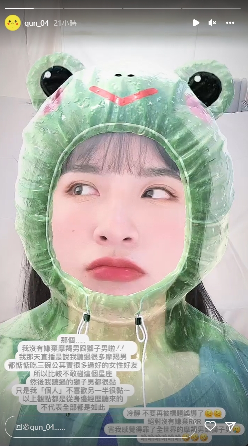 怎料,峮峮的言論讓不少網友誤解成「討厭魔羯跟獅子男」,惹怒了不少網友,許多人紛紛在直播中留言叫屈,場面相當尷尬!對此,峮峮也在19日透過IG發文澄清,她委屈表示,「我沒有嫌棄魔羯男跟獅子男啦!」並再一次還原當時說過的話,強調所有言論都是聽朋友分享後得知,「不代表全部都是如此」,希望大家不要誤解她的意思,也絕對沒有嫌棄的意思,更坦言「害我感覺得罪了全世界的魔羯男跟獅子男」,最後還附上了一個哭臉表情,感覺得出來相當無奈。