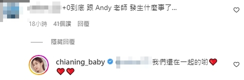 此外,家寧20日也在IG上更新業配貼文,留言區除了有粉絲滿滿的支持,更有不少酸民的負面評論,其中就有人好奇詢問,「+0(家寧)到底跟Andy老師發生什麼事了?」沒想到竟引來家寧本人回覆,「我們還在一起的呦!」最後還附上了三顆愛心,再度以行動破除情變謠言。