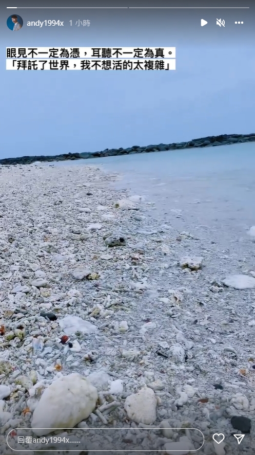 隨著傳言越演越烈,有不少網友還到兩人的貼文下方留言關心起感情狀況,當中也有不少酸民的攻擊,而獨自留在台灣的Andy則透過IG首度發文回應,只見他先是PO出多張坐船玩水的照片,接著又拍下海邊的美景,並且在每張照片都寫下,「眼見不一定為憑,耳聽不一定為真。『拜託了世界,我不想活得太複雜。』」,隨後他也立即刪除了自拍照,只留下美麗的風景,與他無奈的情緒形成強烈的對比。