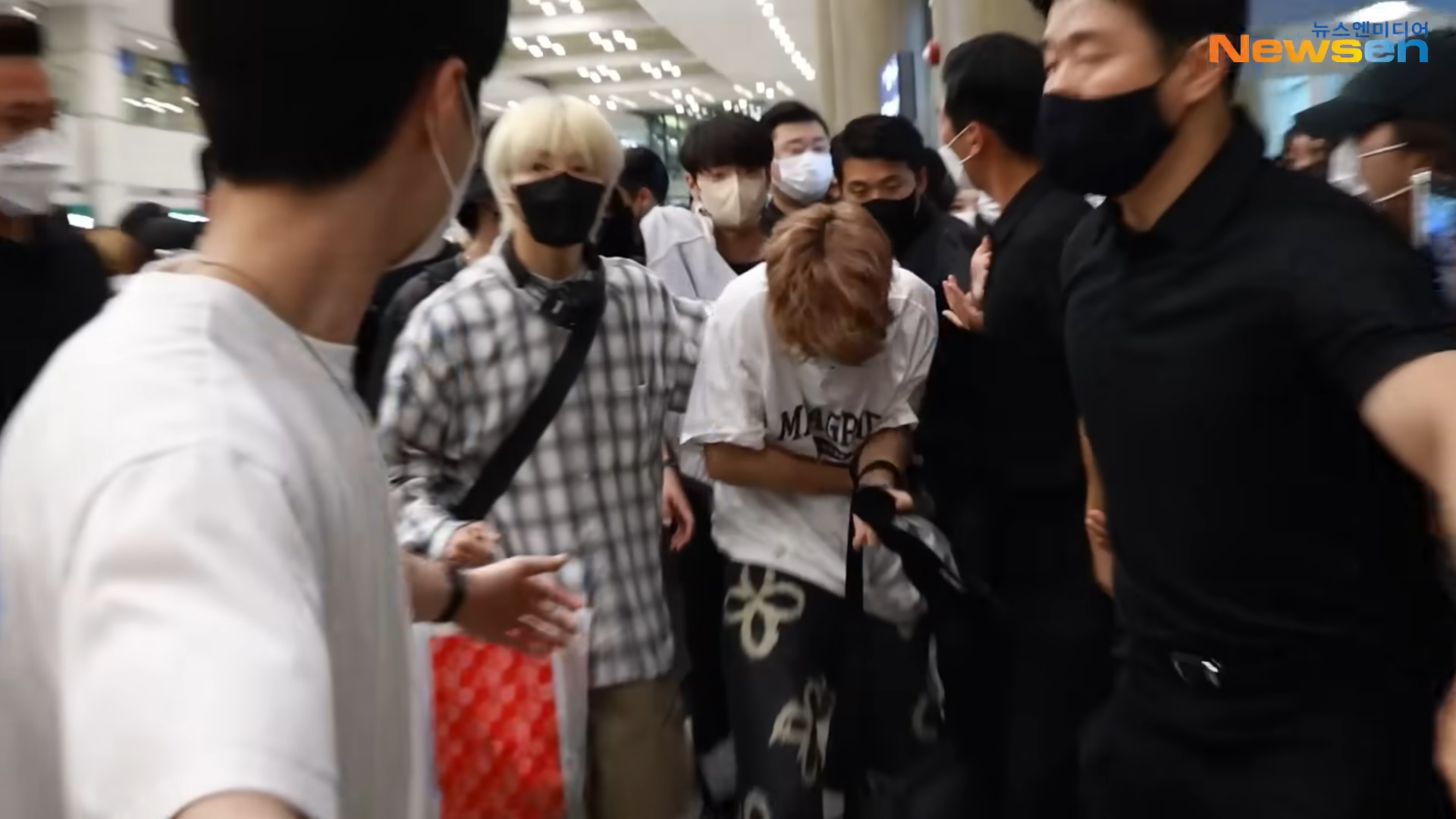 而他們的保鑣在過程中也不斷示意「不要推擠」、「不要靠近」,但粉絲們似乎過於熱情,場面一度相當混亂,連成員HAN都被推擠到整個人狼狽跌在地上,不但帽子跟外套散落一地,手肘也因撞擊地板而發紅,起身後HAN的臉部表情看起來相當痛苦,其他成員也趕緊扶起他,帶他趕緊上褓母車。