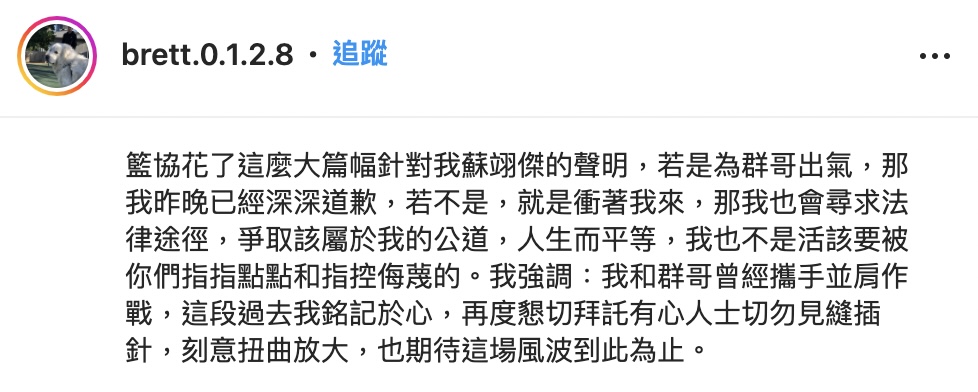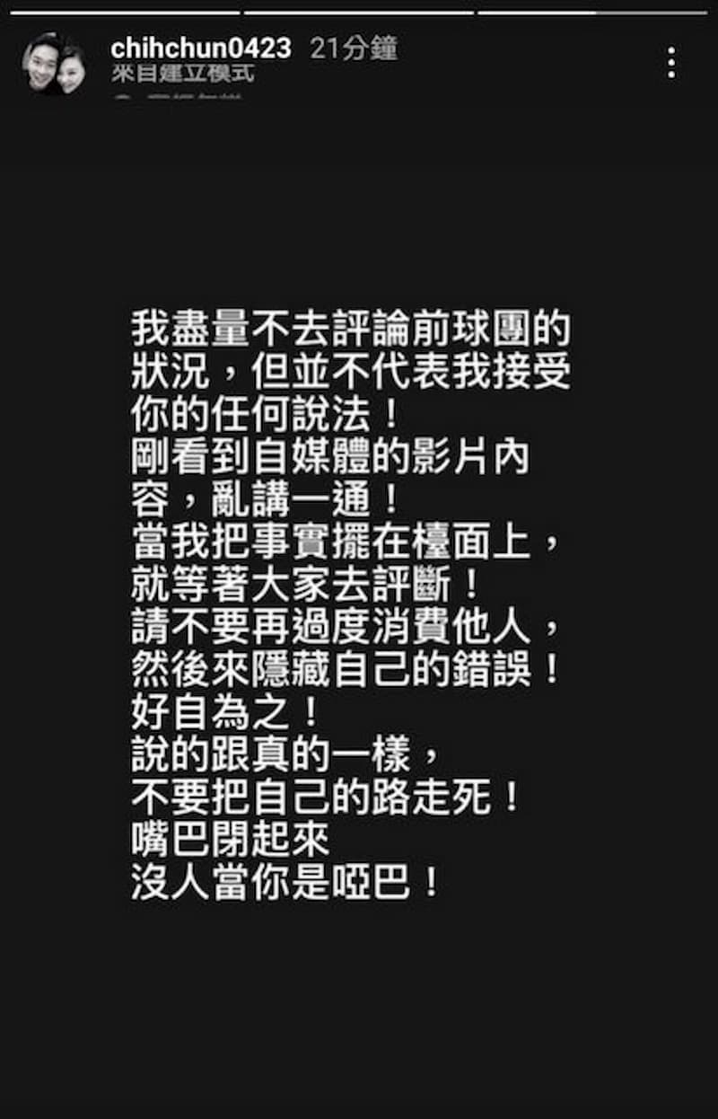 王志群在IG上發文表示:「我盡量不去批評前球團的狀況,但不代表我接受你的說法。」並表示蘇翊傑在節目上的言論都是子虛烏有,接著說道請他不要再過度消費別人,隱藏自己的錯誤,並嗆說不要把自己的路走死,嘴巴閉起來,沒人當你是啞巴,隨後蘇翊傑也在社群上道歉!不過這還沒完,王志群的老婆也在IG發文,表示「蘇先生,你真的夠了」,結果楊敬敏也留言:「狗改不了吃屎,王X蛋」,讓事件愈演愈烈。