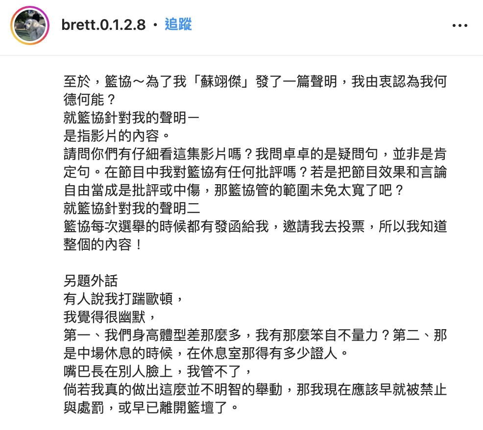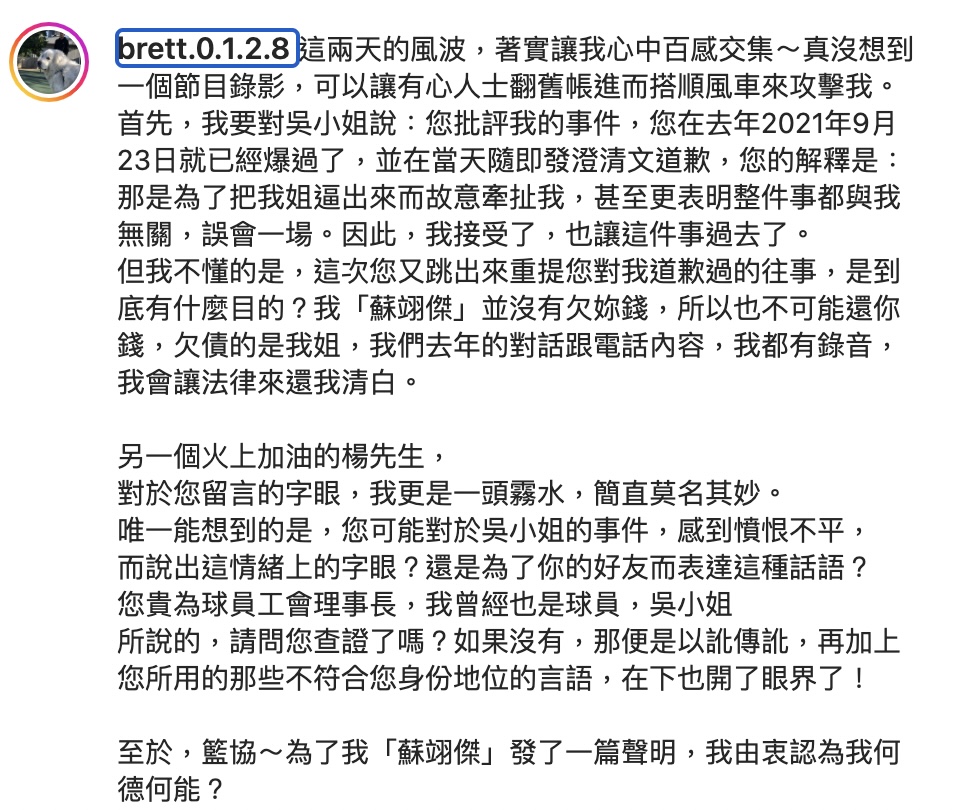 蘇翊傑隨後發文雖未指名道姓,但他寫說:「您貴為球員工會理事長,我曾經也是球員,吳小姐所說的,請問您查證了嗎?如果沒有,那便是以訛傳訛,再加上您所用的那些不符合您身份地位的言語,在下也開了眼界了!」楊敬敏日前才接下台灣籃球球員工會會長,因此可以確定蘇翊傑指的就是楊敬敏。如今一個網路節目的發言成為了各界討論焦點,甚至因為影片中提及籃協的發言,也引起籃協發聲明嚴正否認,只能說職籃的場外話題更讓人關注。