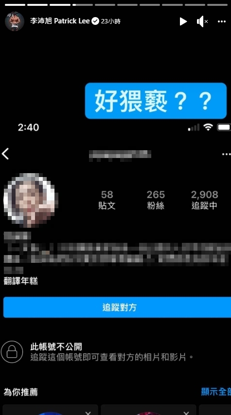不僅如此,還有網友在影片下方留言「好猥褻」,而李沛旭見狀後,竟將對方的照片放大截圖並表示,「猥褻?你家有鏡子嗎?」似乎是對於網友的長相頗有微詞。貼文曝光後,網友紛紛認為他的用詞及行為太超過,「我是覺得無論如何都不能口出惡言!況且人家只是善意提醒!」、「沛旭哥的腦袋也都是肌肉嗎?」、「情旭失控現場」、「隨便罵人智障就是修養不足了」、「EQ比體脂還低~」