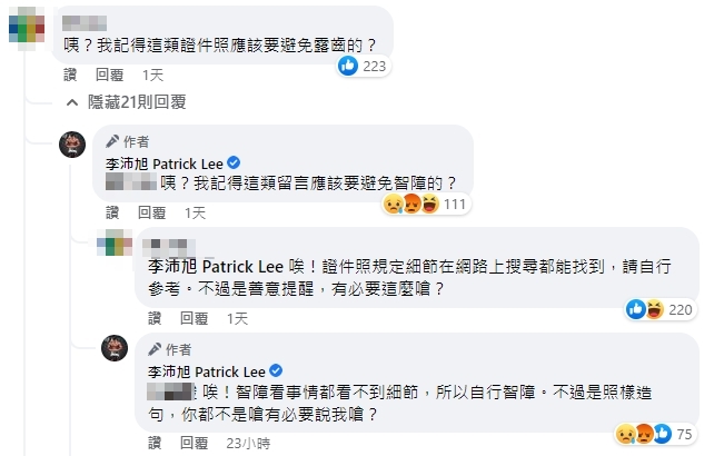 李沛旭26日在臉書PO出拍證件照的影片,只見他疑似是拍好照片之後,故意在機器前面露齒微笑,但有網友誤以為他是露齒拍攝證件照,所以好心提醒,「我記得這類證件照應該要避免露齒的?」怎料,此舉竟點燃李沛旭的怒火,他故意以造樣造句的方式回嗆,「我記得這類留言應該要避免智障的?」對此,網友無奈表示自己只是好心提醒,「有必要這麼嗆?」戰火瞬間引爆!