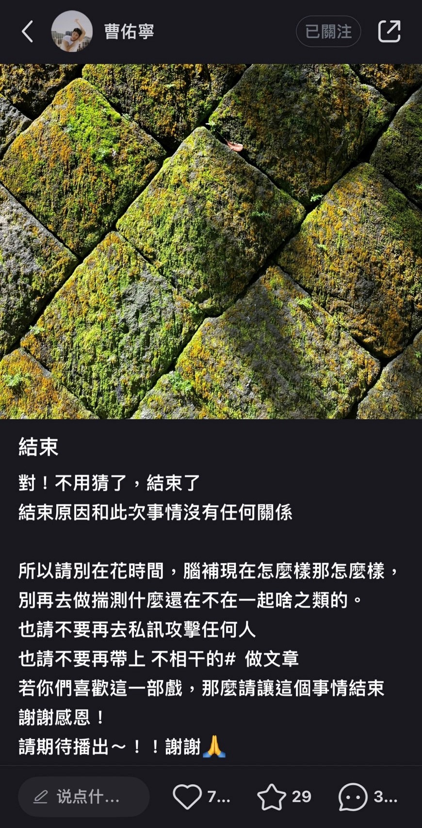 後來,曹佑寧則在27日透過小紅書透露兩人情變的消息,並強調分手原因與兩女間的矛盾毫無關聯,不希望大家隨意謠傳,「別再去做揣測什麼還在不在一起啥之類的,也請不要再去私訊攻擊任何人!」