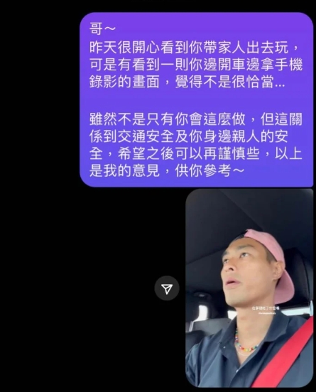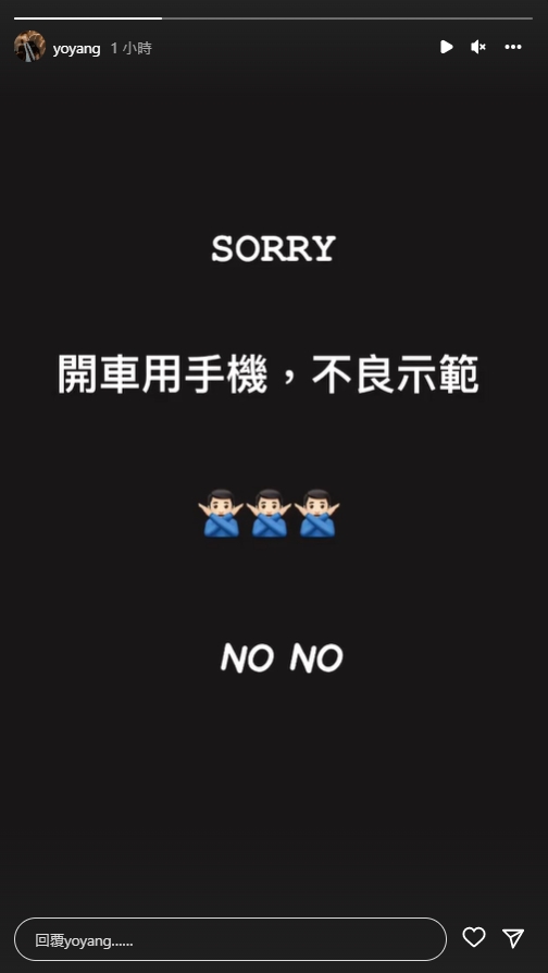 原PO表示自己不是黑粉,甚至還很欣賞楊祐寧的演技,只不過對於開車使用手機的行為還是無法苟同,他還特地私訊對方表示,「有看到一則你邊開車邊拿手機錄影的畫面,覺得不是很恰當」,由於攸關到交通及家人安全,因此希望他可以謹慎一點,禮貌的用詞還獲得了其他網友的好評,只可惜最終還是沒有得到回覆。事隔多日後,楊祐寧透過IG發文道歉,「SORRY,開車用手機,不良示範,NO、NO!」這才讓網友氣消,並希望他能改進。