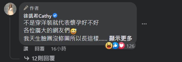面對越來越多網友誤解,徐凱希決定在臉書留言澄清,「不是穿洋裝就代表懷孕好不好!」也順便解釋自己事實上並沒有變胖,「其實我變瘦了,我天生臉圓沒修圖所以長這樣~」,謠言四起讓她感到十分冤枉。