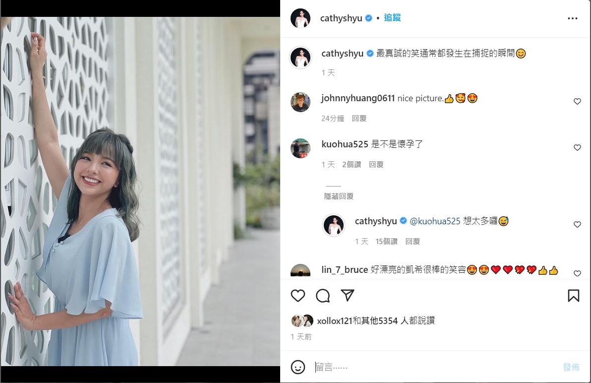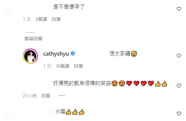 殊不知,這張照片卻引發網友瘋猜「懷孕」,一大票網友紛紛留言問,「是不是懷孕了?」、「有孕味哦!」讓徐凱希無奈的回應道,「想太多囉!」、「這個看到真的不會開心~」。