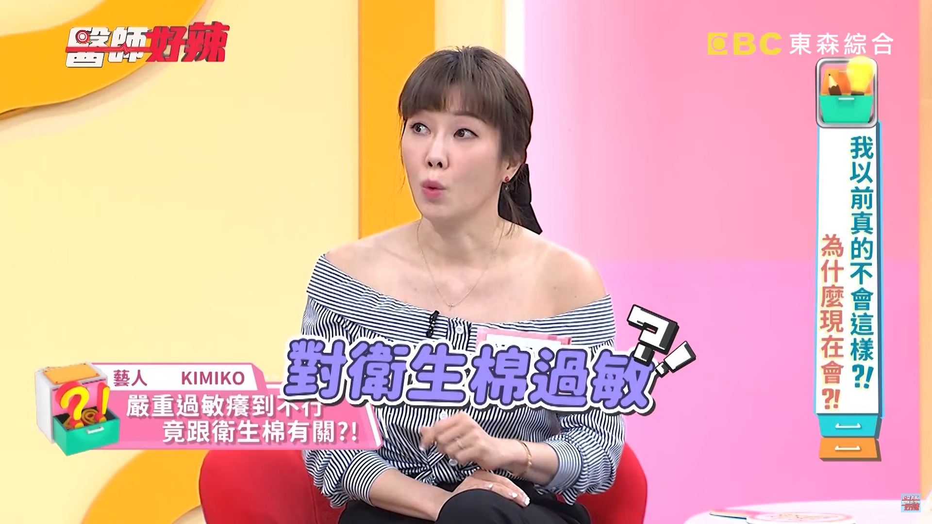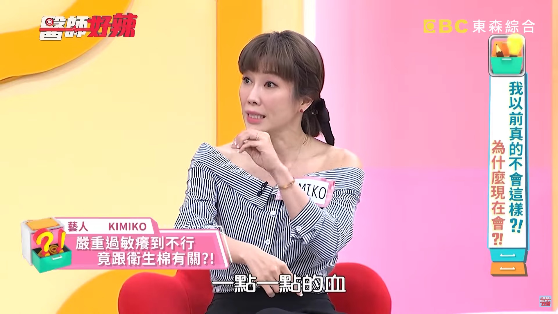 不僅如此,KIMIKO還透露,光是從身體發紅的程度就能知道生理期的來去時間,癢的時候甚至連緊身衣都穿不住,從她提供的照片可以看到,她的背部一整片發紅浮腫,嚴重程度就連徐乃麟看了都驚呼,「妳這是被家暴吧!」雖然看了醫生,但是擦藥、吃藥也已經抑制不住,後來才發現有可能是身體會對衛生棉過敏!