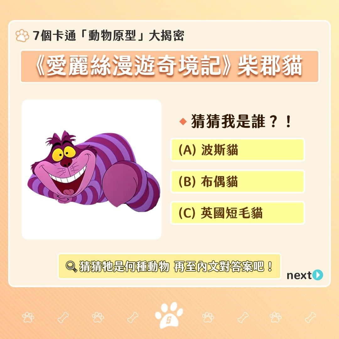 另外,美國奇幻卡通《探險活寶》中的主角「老皮」,雖然外型為黃色、伸縮自如,且設定還是從一顆蛋孵化,不過事實上老皮卻是以「鬥牛犬」為原型!而《愛麗絲漫遊奇境記》中神秘柴郡貓的原型其實是一隻虎斑紋的「英國短毛貓」。