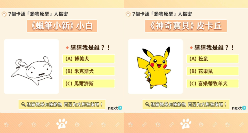 日本動漫部分,《蠟筆小新》主角野原一家所飼養的愛犬「小白」,其實曾因前飼主突然對狗過敏,因此就將小白遺棄在路旁,後來則被小新撿走。據了解,小白其實和他其他三個兄弟姊妹長相不同,父親則是流浪犬,因此也被認為是瑪爾濟斯混種狗!至於《寶可夢》主角小智第一個寶可夢「皮卡丘」,雖擁有長耳、閃電型尾巴,臉頰部位還會放電,不過牠卻是以「松鼠」為原型,事實上動漫中也歸類牠為「鼠寶可夢」!